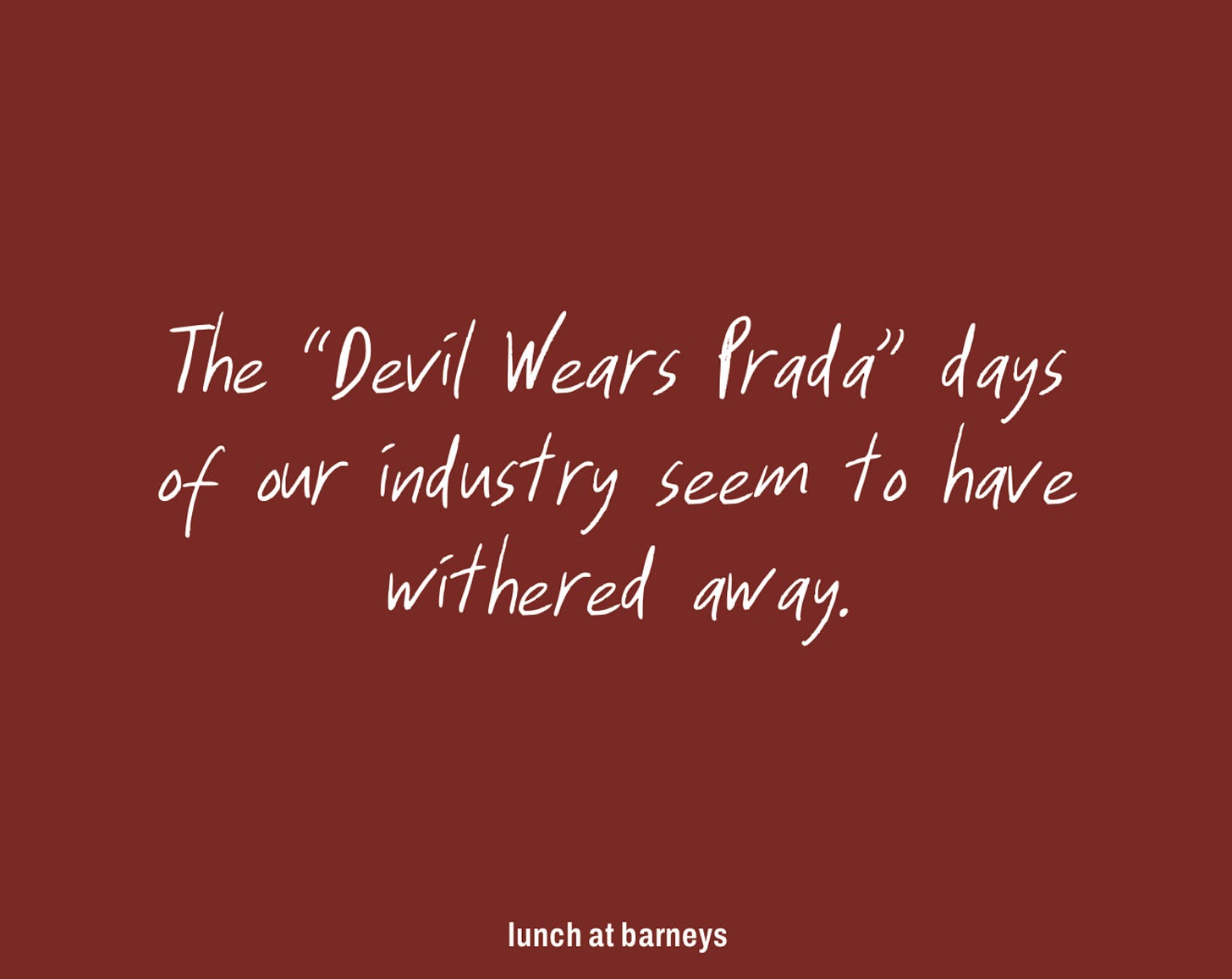 This is part of a more macro trend, but The Devil Wears Prada days of our industry seem to have withered away. Work/life balance and a kinder, more empathetic approach appear to be more the norm now.